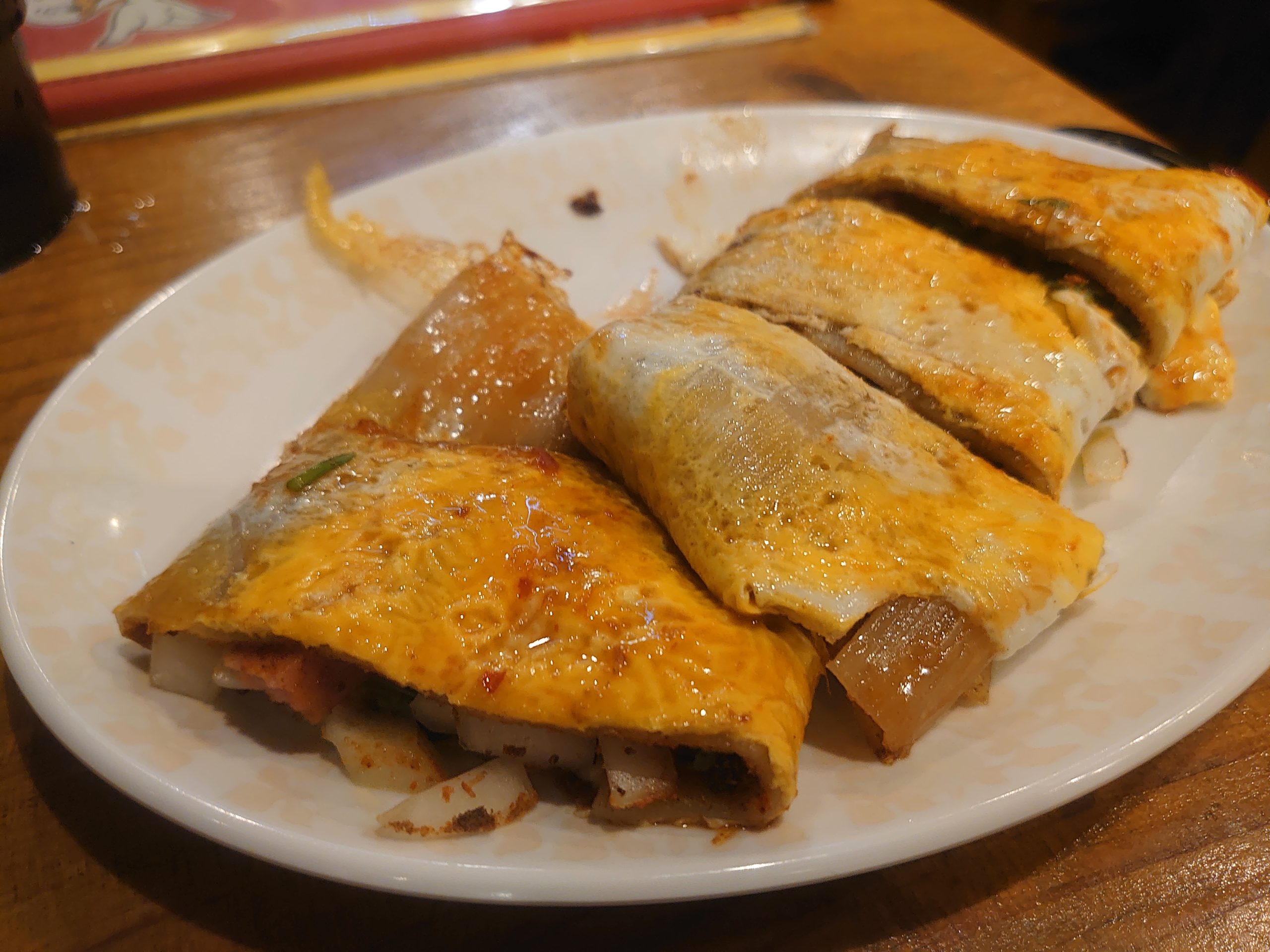 太い冷麺に卵をからませ、野菜などに巻いているんだと思います。
