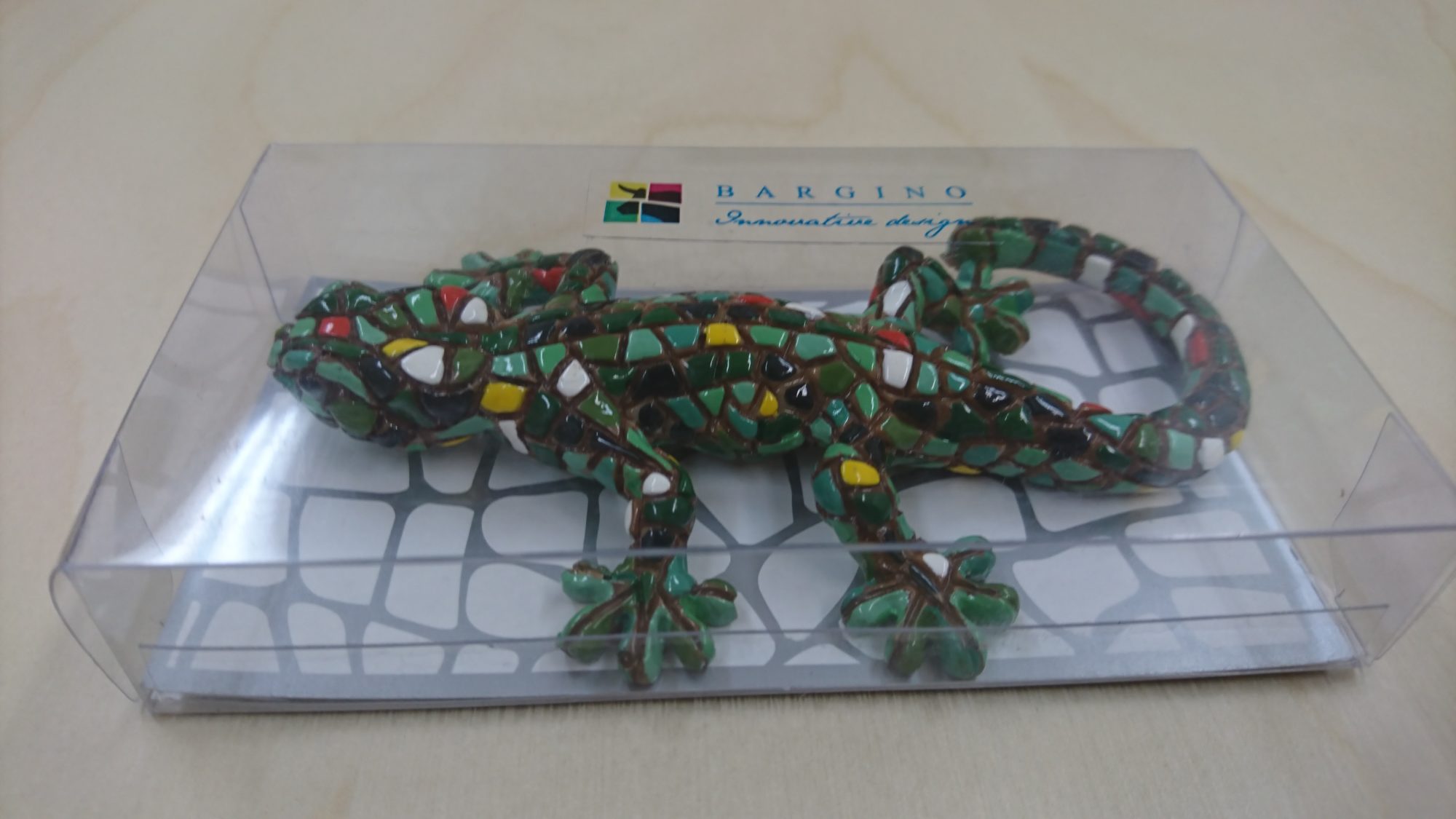 ガウディのとかげとのことです。きれいで、存在感があります。さっそく、事務所のかべのマグネットを貼れる部分にくっつけさせていただきました。